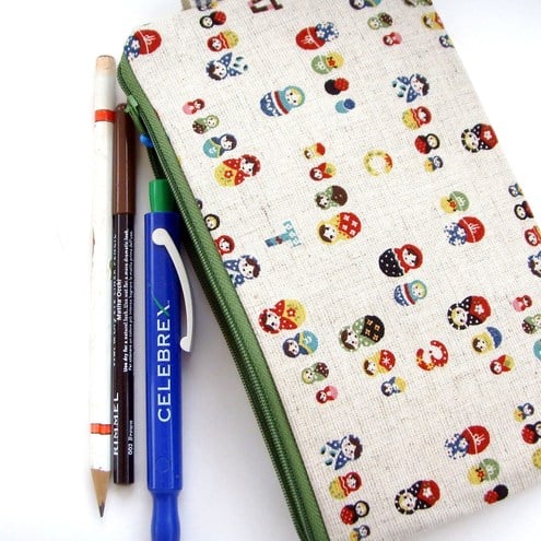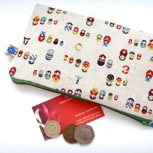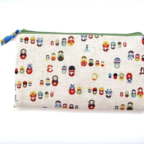 Cute Russian doll make up bag / pencil case with contrasting zipper and ribbon and blue spotty lining