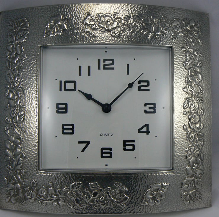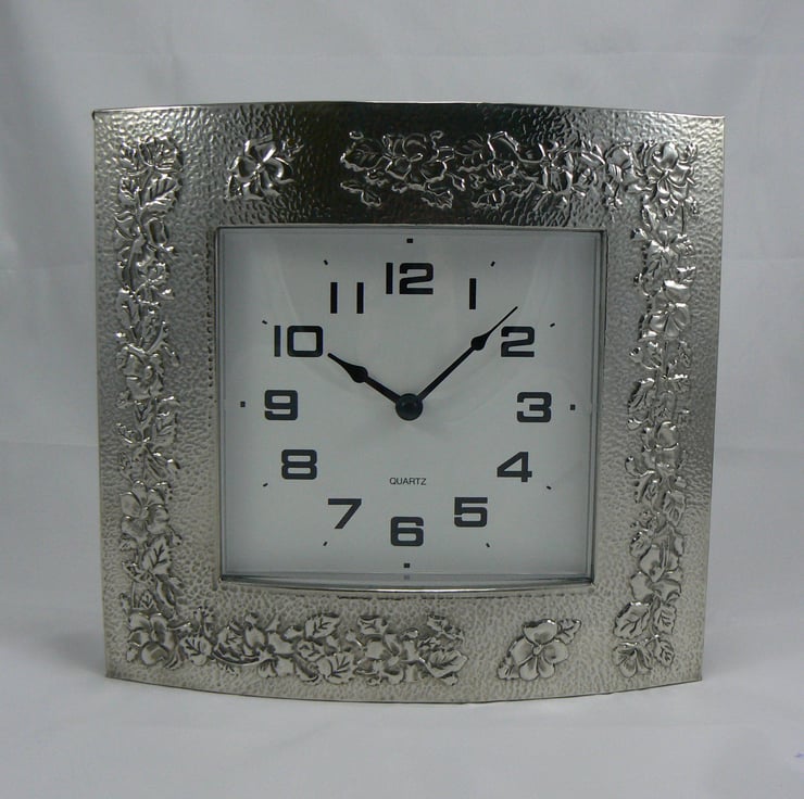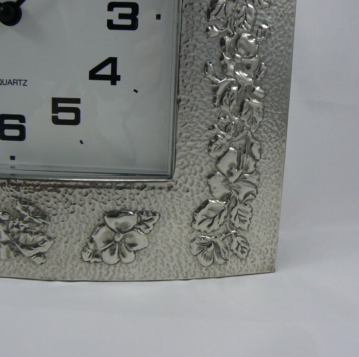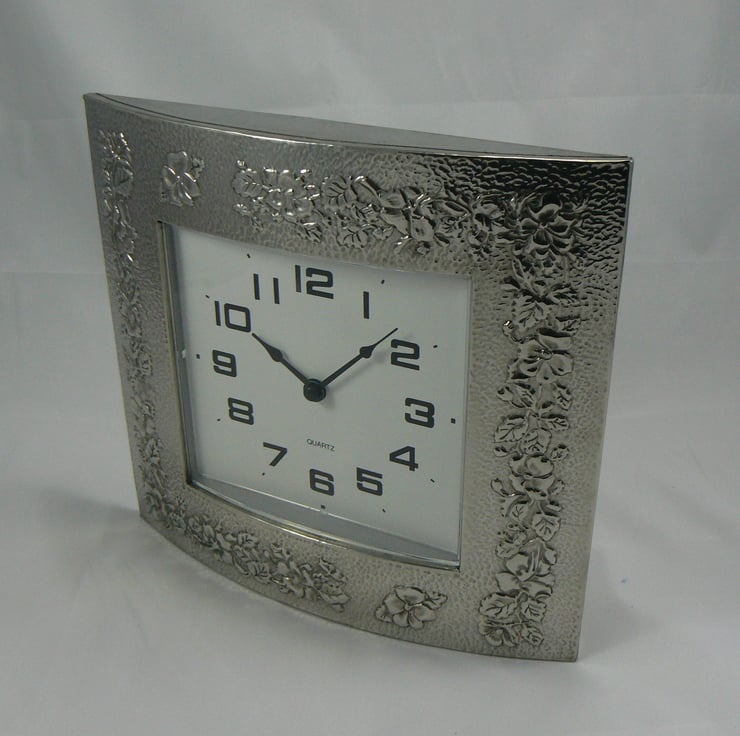 Pewter clock with floral design measuring 11 1/2" wide by 10 1/2" tall with face measuring 6 1/2" wide by 6" high . This clock takes 1 x AA battery (not included) and has a hanging slot.