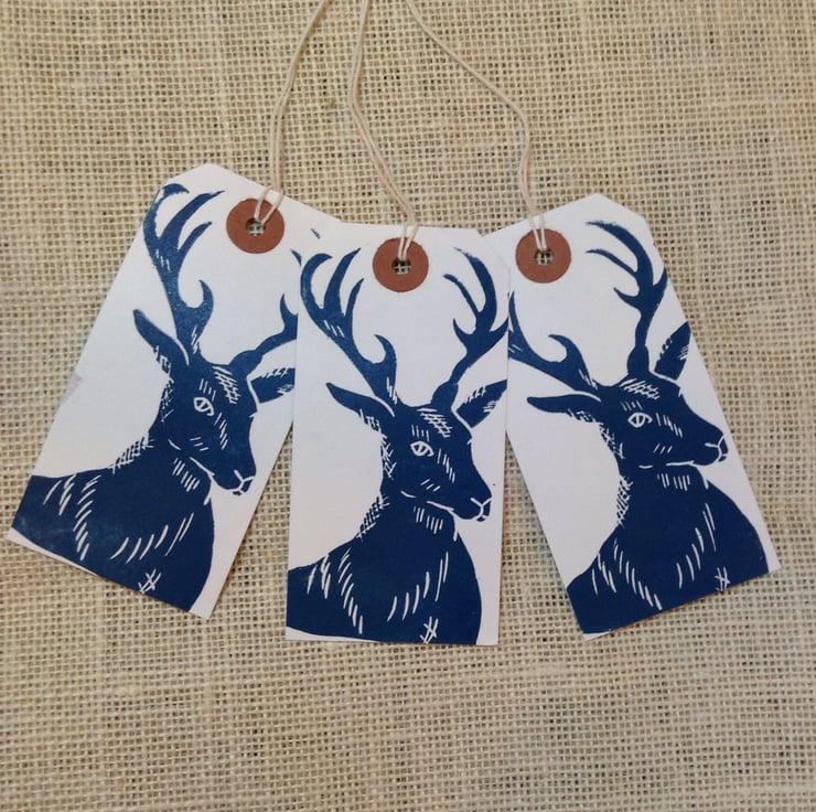 Set of three stag gift tags, hand printed with a beautiful muted blue bowl our on white card.
