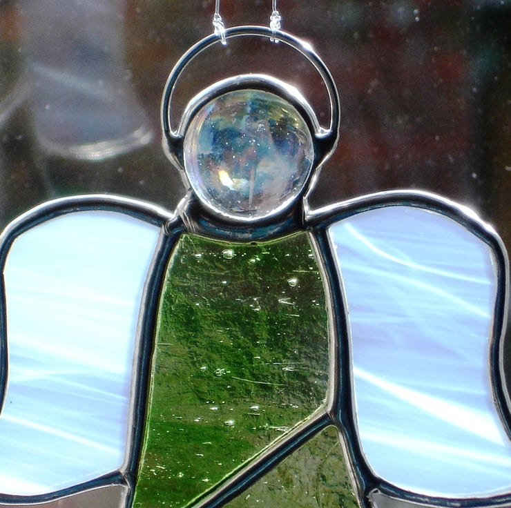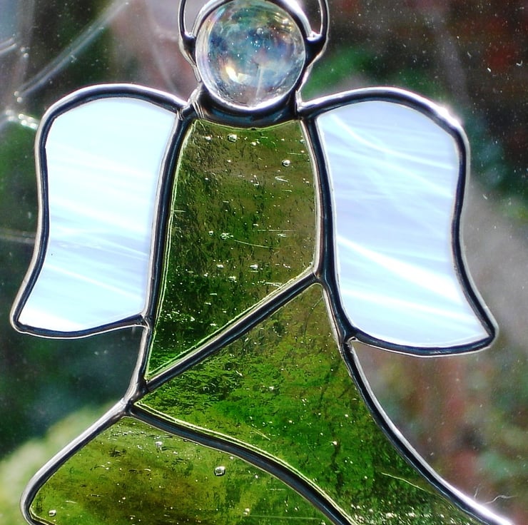 Hand-crafted Stained Glass Angel made using the Tiffany copper foil method. Our Angel is finished with a lovely beaded solder and then polished to add sparkle. I have used an unusual pale green and brown streaky glass which made me think of woodland fairies when I was making it. The wings are cut from white wispy glass. She comes with a hand tied loop ready to display.