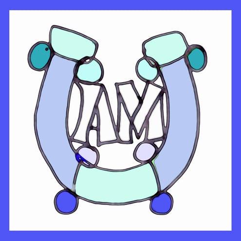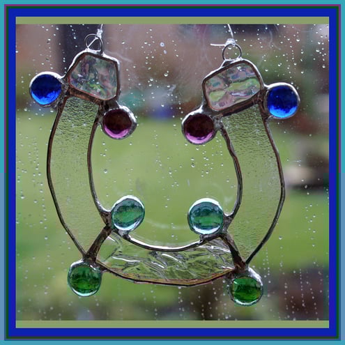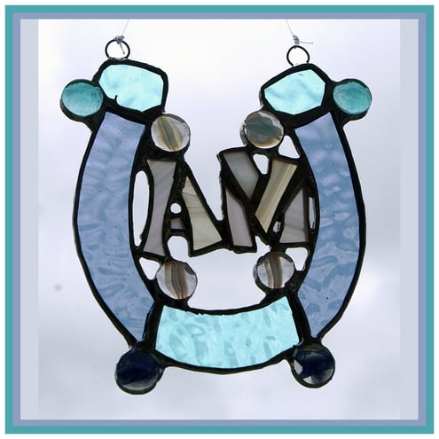 It is a stained glass suncatcher made using the Tiffany copper foil technique and is a special version of my normal Horseshoe by the addition of the initials and using prettily textured turquoise and blue glass rather than clear. The little coloured jewels made from round glass nuggets to represent the horseshoe nails are in turquoise, blue and white to match the glass.