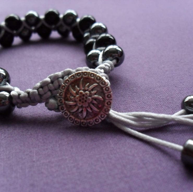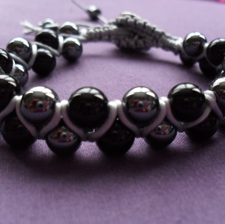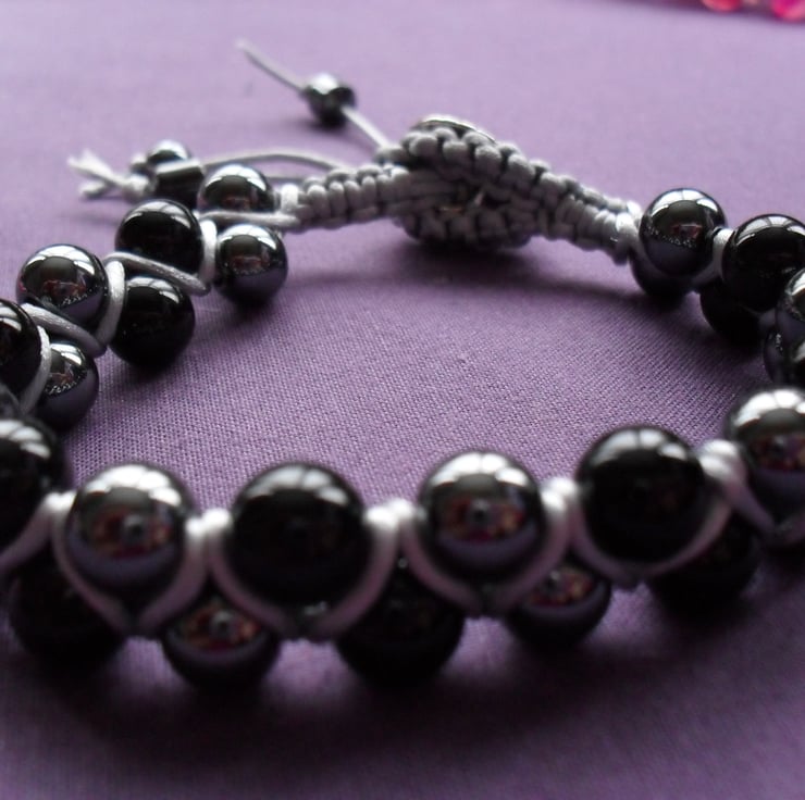 Black agate and hematite approx 8 mm beads are threaded using silver thread and attached to a silver tone button to fasten bracelet with small hematite beads on the ends of the thread