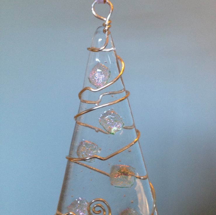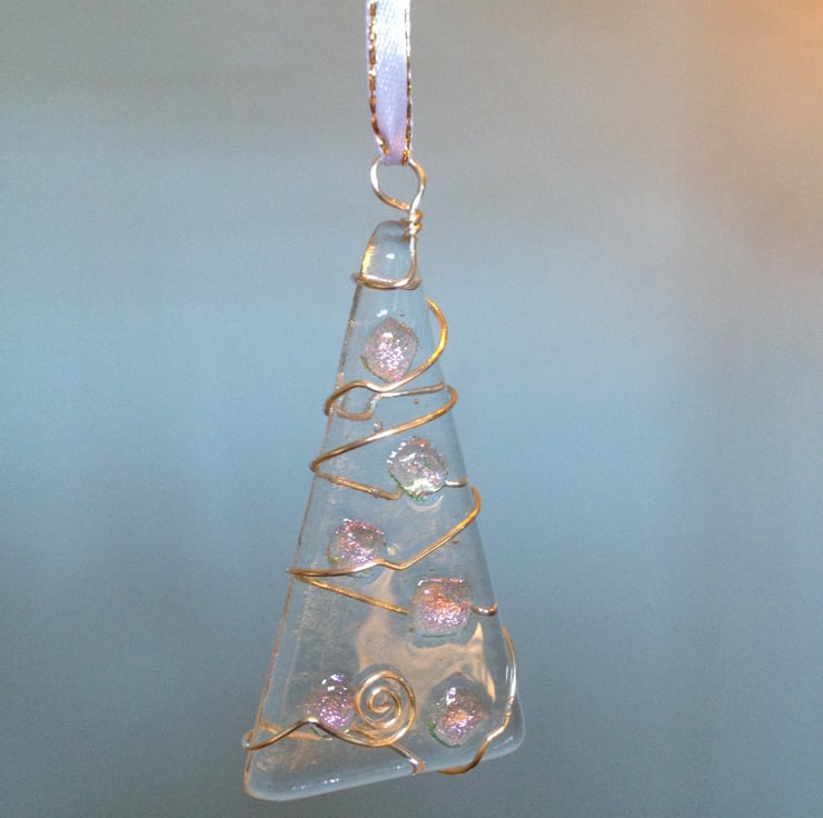 A beautiful handmade glass christmas decoration made from fused bullseye glass decorated with pieces of pink/purple dichroic glass. The tree is embellished with silver plated wire and strung with ribbon for easy hanging