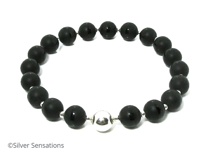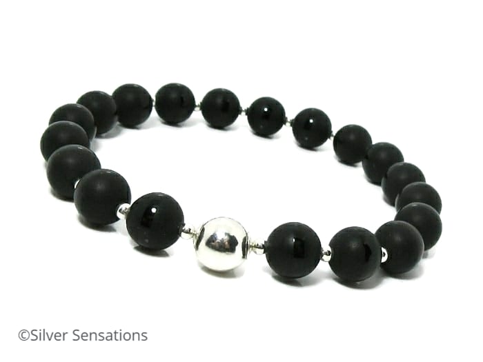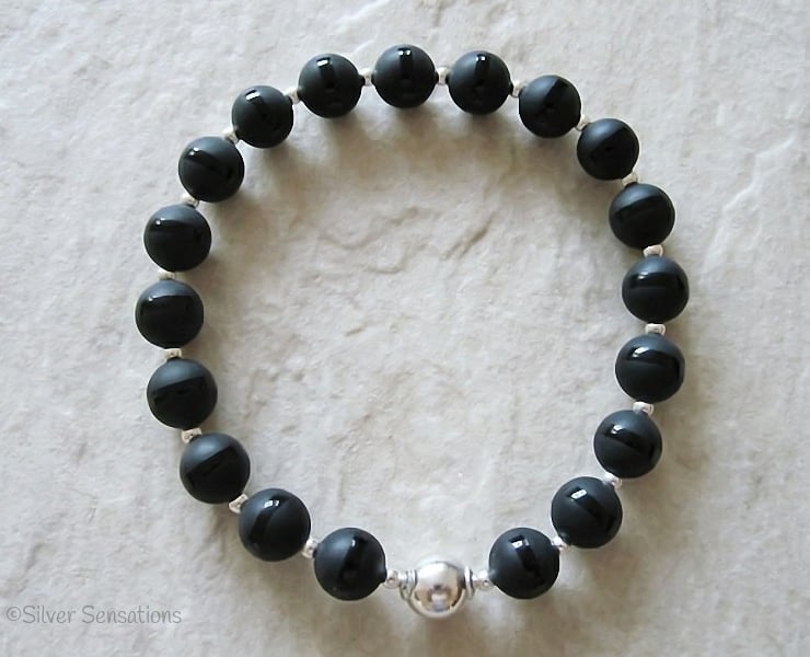 This lovely stretch bracelet has been designed & hand made using unusual frosted 8mm Black Onyx round beads which have a glossy stripe running around each bead.