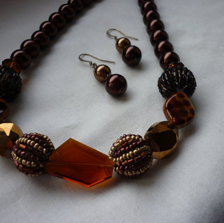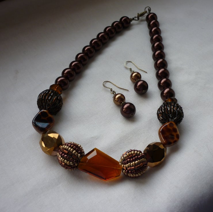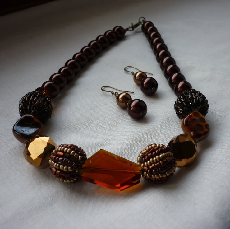 THE NECKLACE HAS BEEN MADE WITH A COLLECTION OF BEADS IN SHADES OF BROWN, BRONZE AND COPPER IN GLASS BEADS, ACRYLIC BEADS AND 12MM GLASS PEARLS AND HAS BEEN FINISHED WITH ANTIQUE BRONZE LOBSTER CLASP AND FINIDINGS.