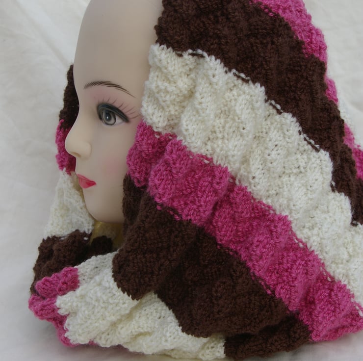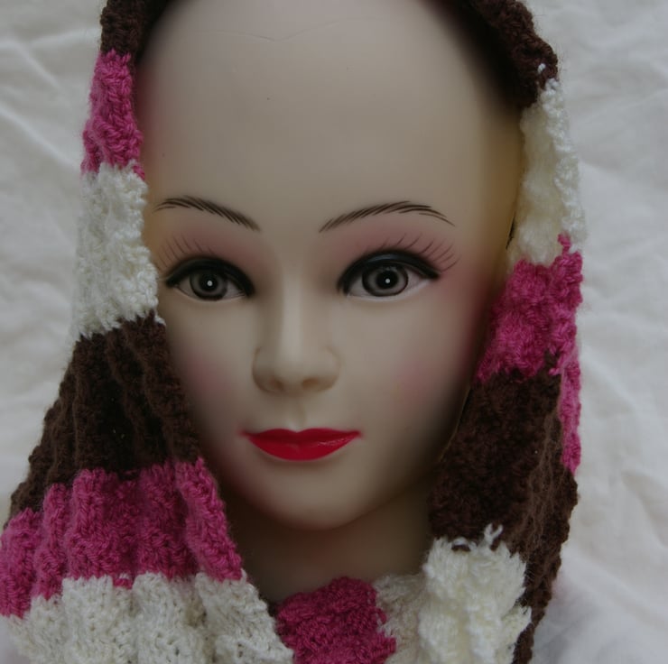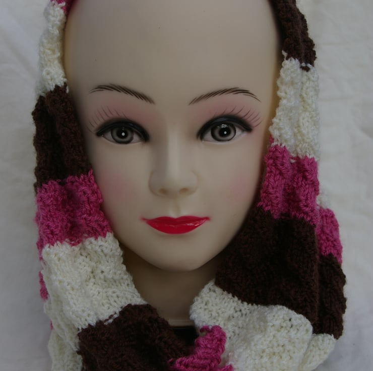 A very pretty Cowl/scarf hand knitted in dark brown, cream and dusty pink. This warm soft pretty item can be worn around the neck like a scarf or pulled up over the back of the head and worn as a Cowl in order to keep both your head and neck warm. This Cowl/Scarf would make a very stylish accessory to any woman’s Autumn/winter wardrobe. Knitted in soft Acrylic yarn so a lovely item for anyone one who is allergic to animal yarns as well as being a easy item to launder.