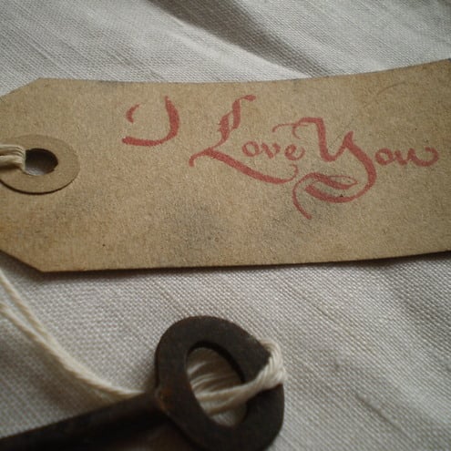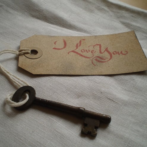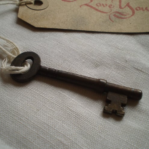 Give someone the key to your heart.... a gift tag with difference. I have "grunged" and stamped the words "I LOVE YOU" onto a luggage label. Attached is a vintage key. Tied to a gift, flowers or even a new car!!!! .... the sentiment behind it could be for your special someone. Could also be used in altered art and scrapbooking