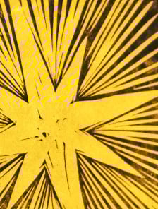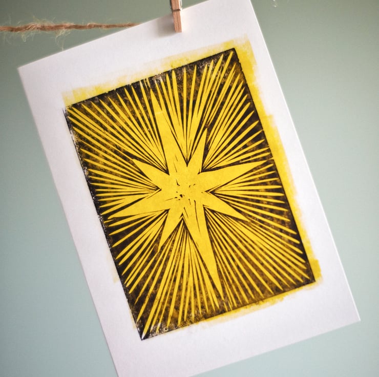 A bright and striking A6 greetings card printed from an original linocut by Sophie Mutter. Black on golden yellow.