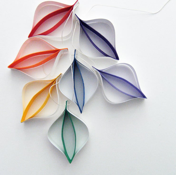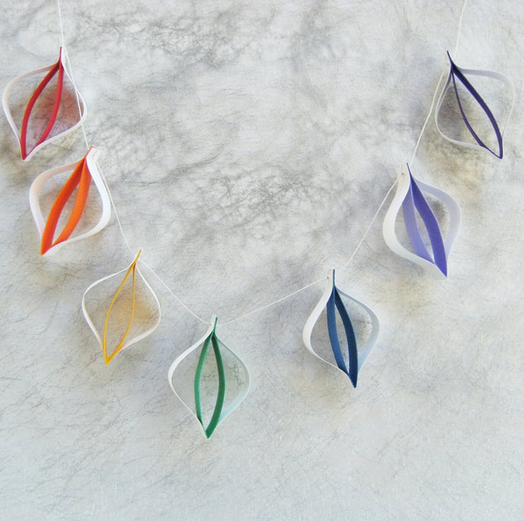 The decorations are hand made from strips of stiff coloured paper. They are arranged in a rainbow - one each of red, orange, yellow, green, blue, purple, violet.