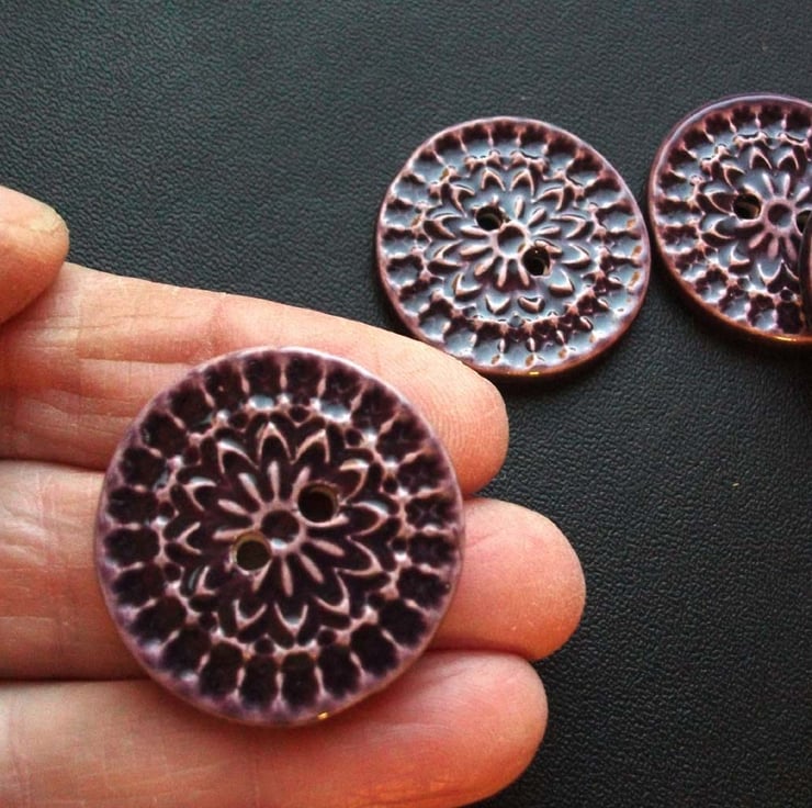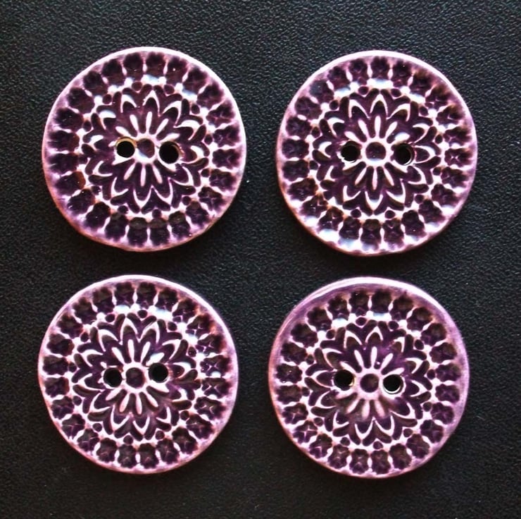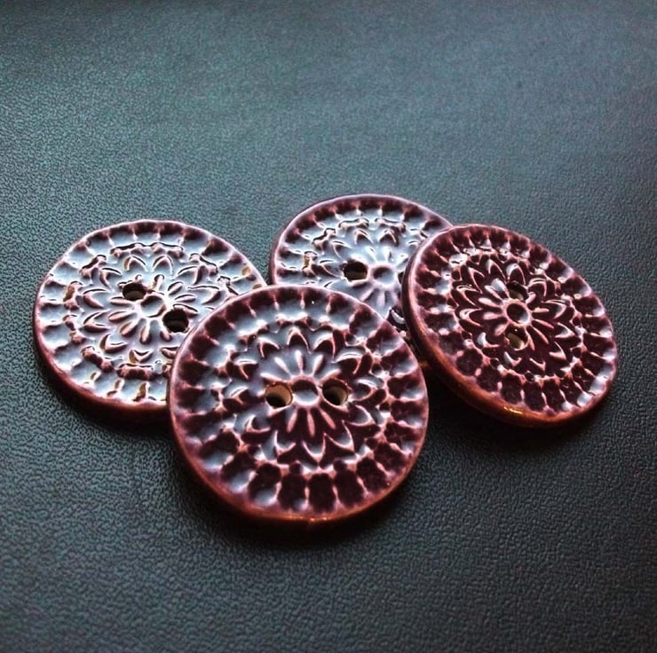 This set of four buttons are made from white earthenware clay, embossed and glazed to 1100 degrees, so nice and strong.