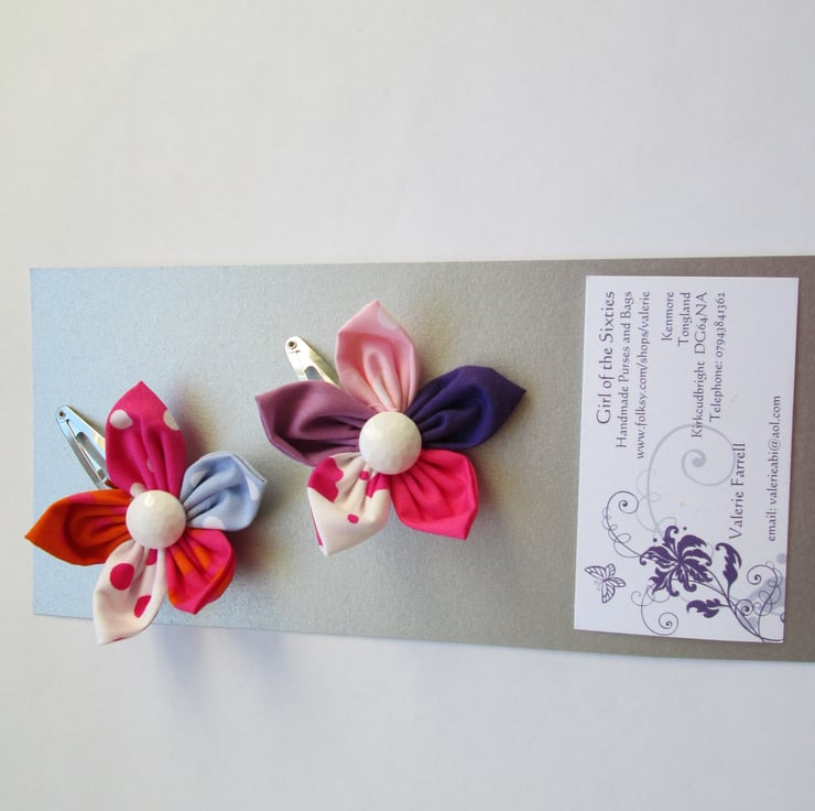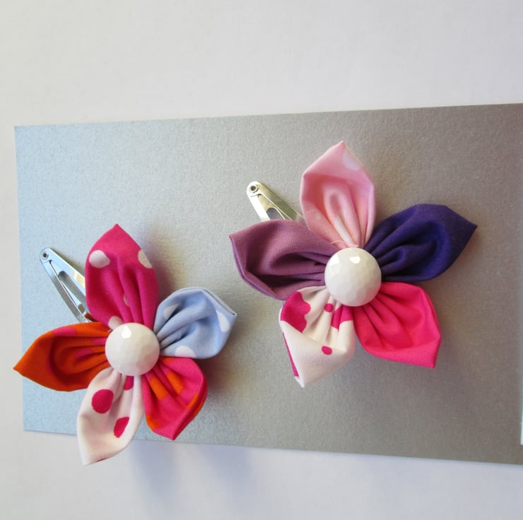 Two pretty fabric hair clips made up of 5 petals and button centre with a clip on the back