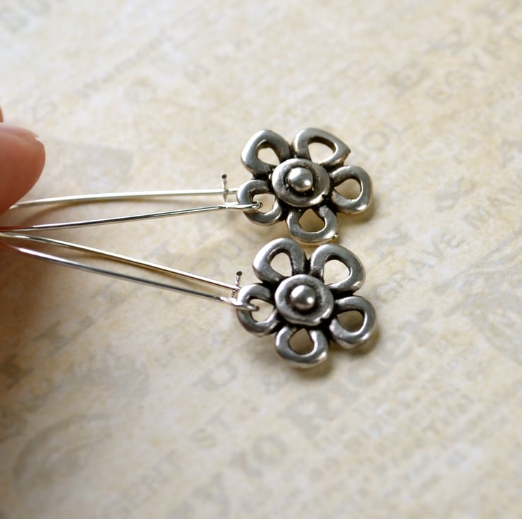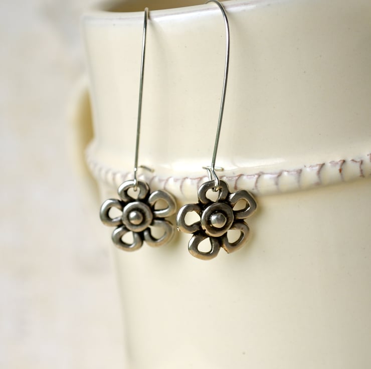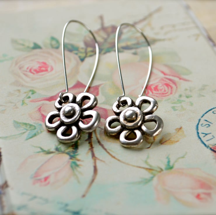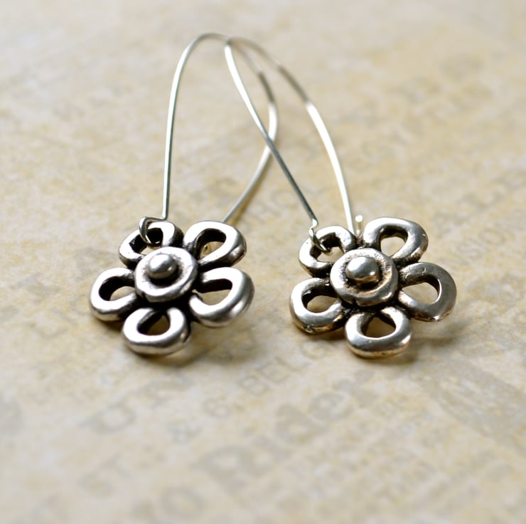 These sweet little earrings have a silver daisy charm suspended from long kidney wires for a modern yet retro look.