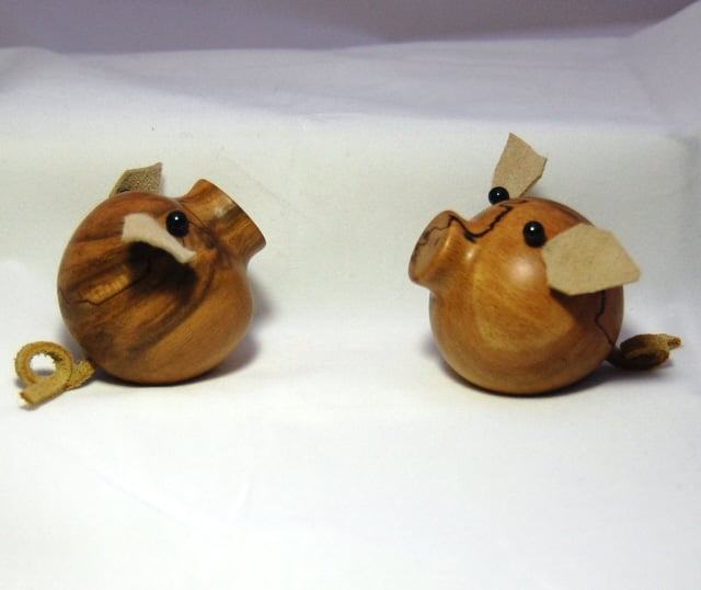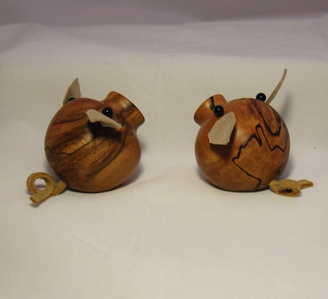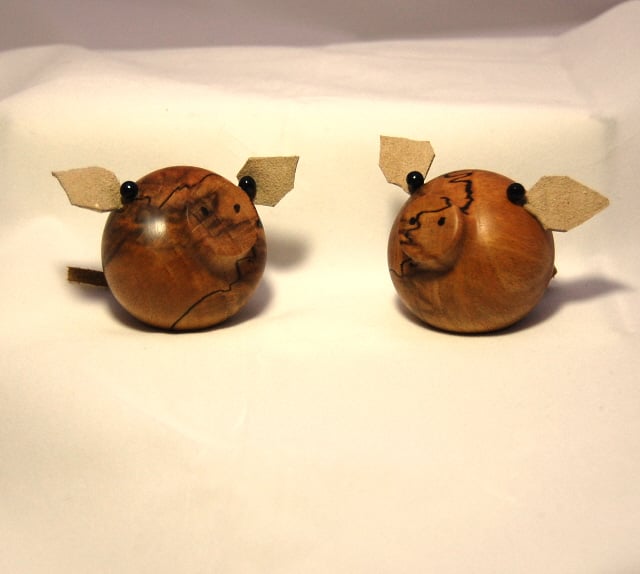 Here’s a happy pair of pigs, all ready to help in the crafter’s search for those dropped and missing pins and needles. These charming little pigs, hand turned and polished, are made from spalted beech. They have soft suede ears and tails, and a strong magnet set into the bases. To find those elusive pins, simply pass the pig over the area where you know they are hiding. Soon you will have them found, waiting to be taken off the base of the little pigs and put safely back into your pin cushion or box.