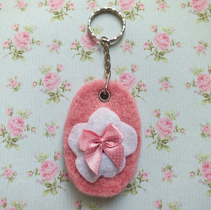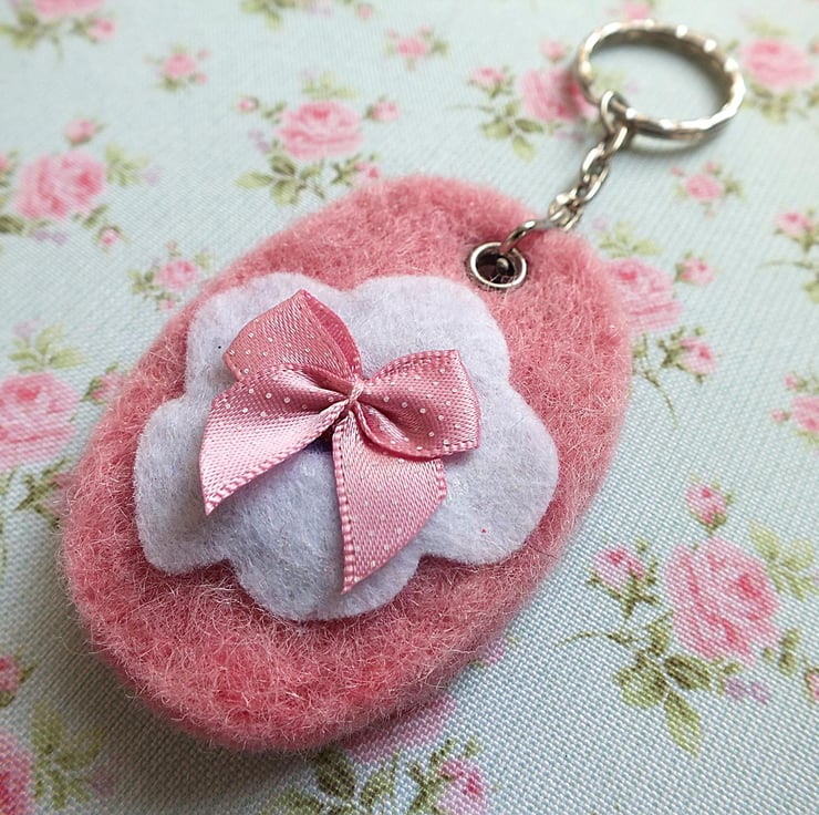 Lovingly crafted from felt and garnished with a sweet pink bow, this key fob adds a splash of vintage chic to a lady's purse. Complete with key chain and ring, the fobs in this collection measure approx 4cm wide by 7cm long.