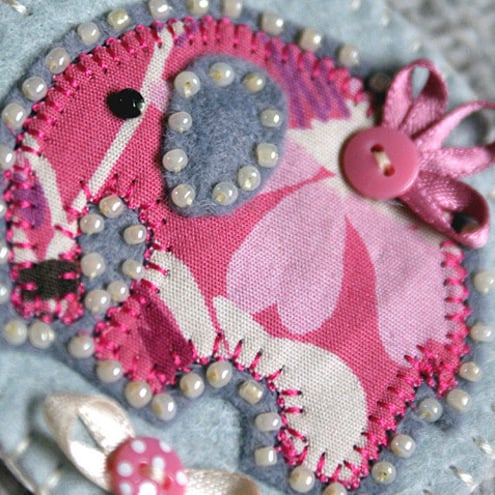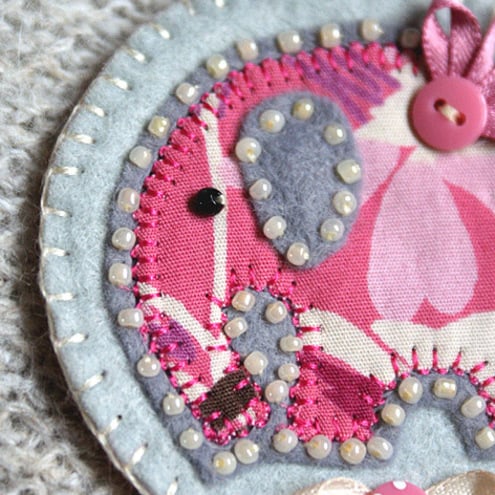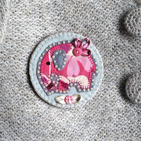 A cute handmade fabric elephant brooch. Featuring a cotton print elephant appliqued onto a felt base, edged with cream beads and finished with pretty ribbon and buttons details. Mounted onto a circular felt backing and complete with brooch backing for easy attachment.