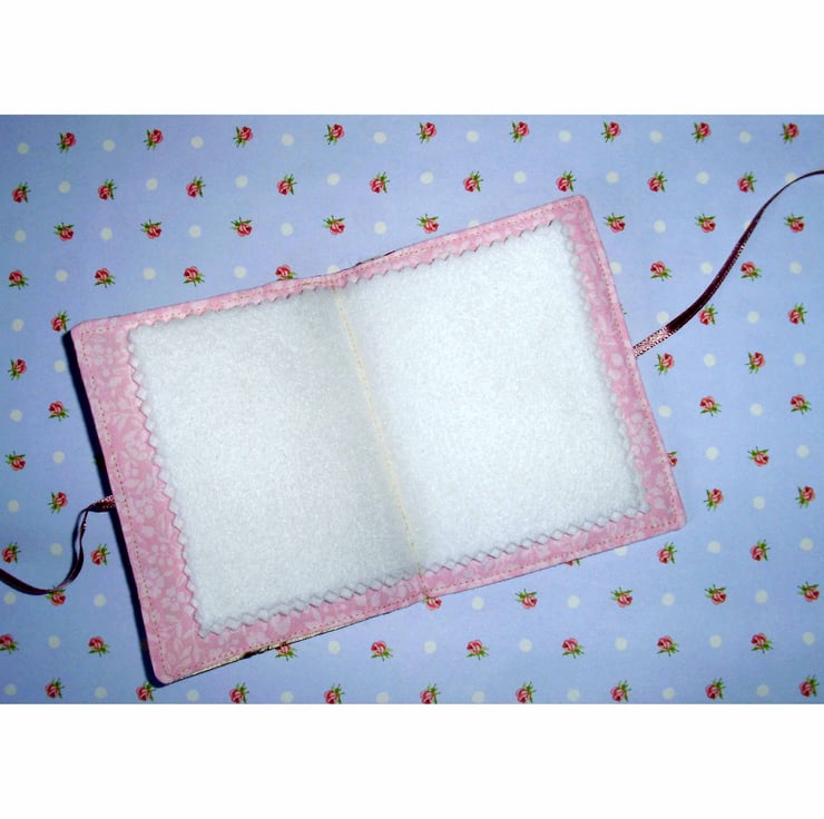 This needle case measures approx 4.5 x 3 inches and is made a beautiful embroidered satin fabric. It is lined in toning print cotton fabric and has four felt leaves for your pins and needles. It is fastened with ribbon ties, which can be tied right round the case for protection in a bag.