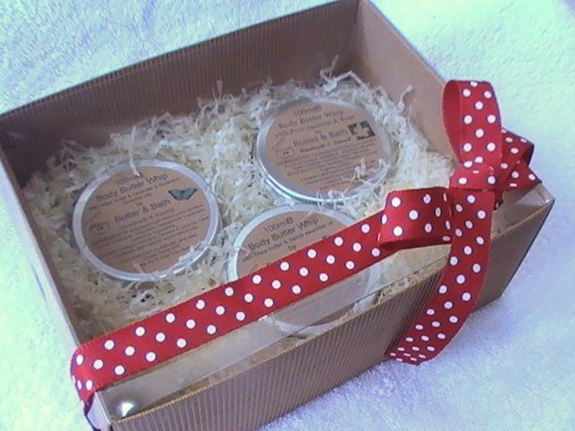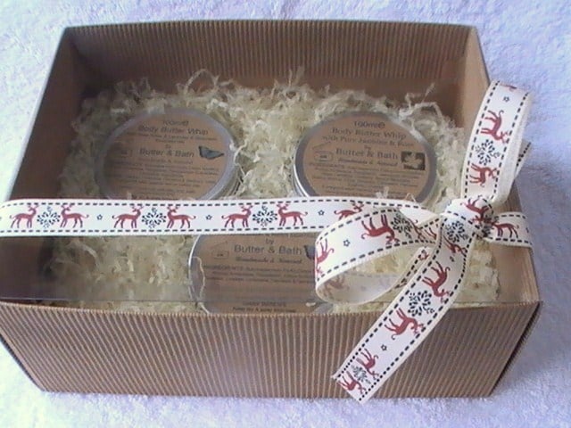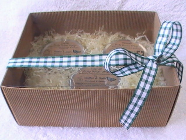 A pretty gift set containing a selection of three of our handmade and natural body butters nestling in a very lovely, natural looking box, all finished with a beautiful ribbon tied into a bow.