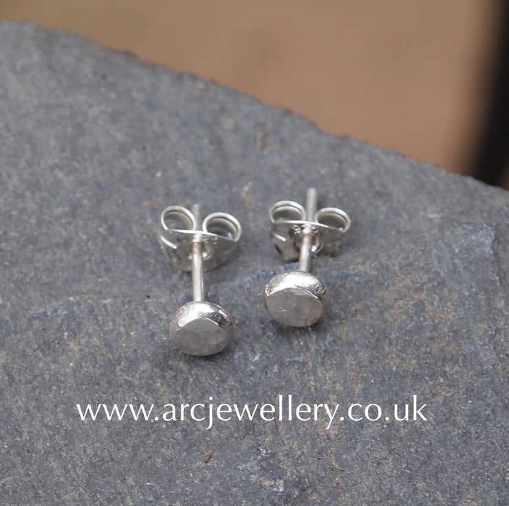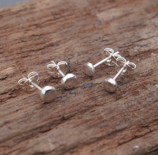 A tiny piece of recycled sterling silver has been hammered to shape it and add texture to the surface. These little studs are not uniform so have a lovely organic feel to them and make great stud earrings for everyday wear or for a second...third...fourth piercing.