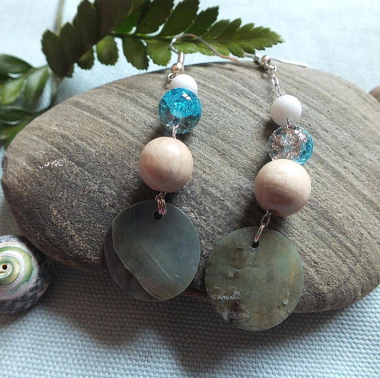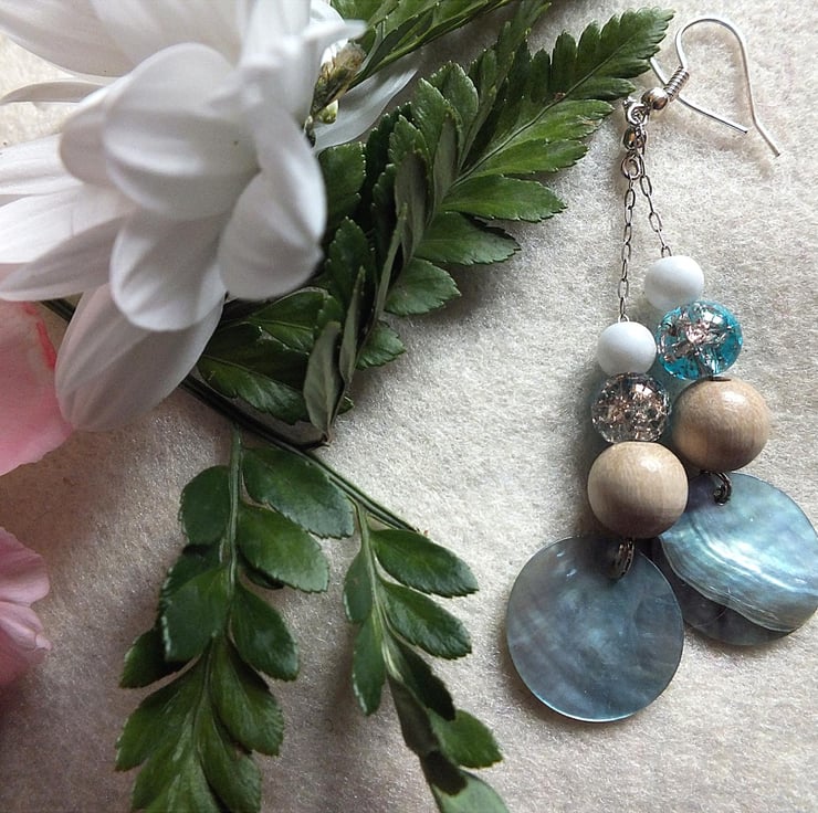 These beautiful long danglies are composed of a motley crew of ceramic, glass, wood and shell beads on a silver plated chain and hook. Approx 6cm long.