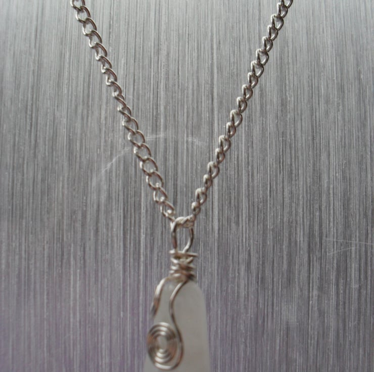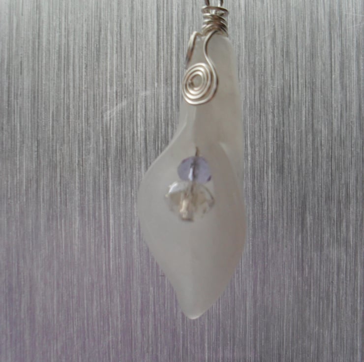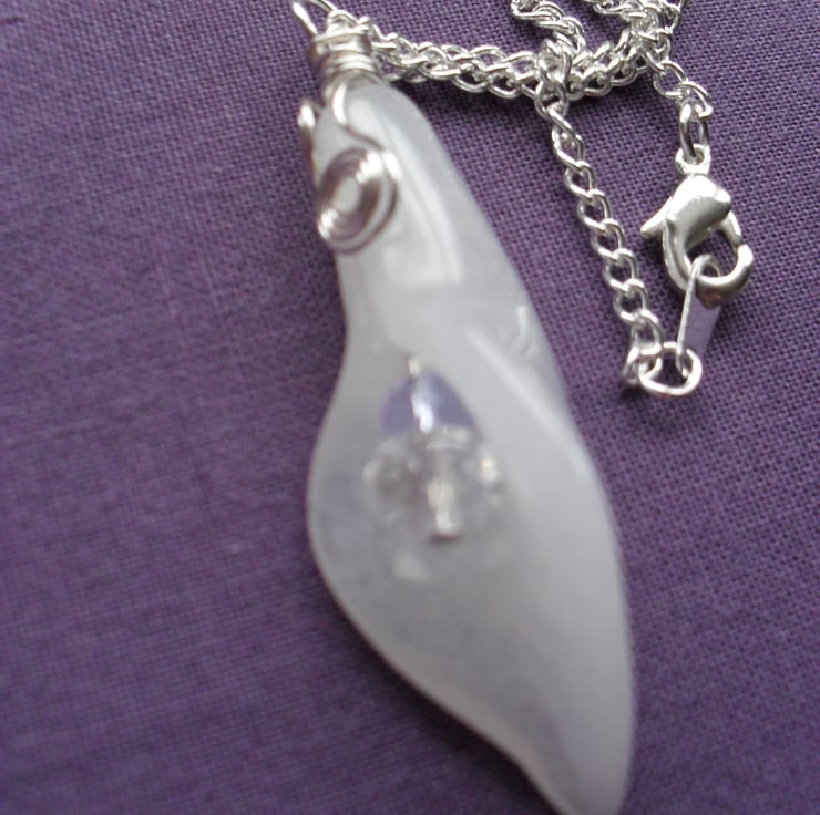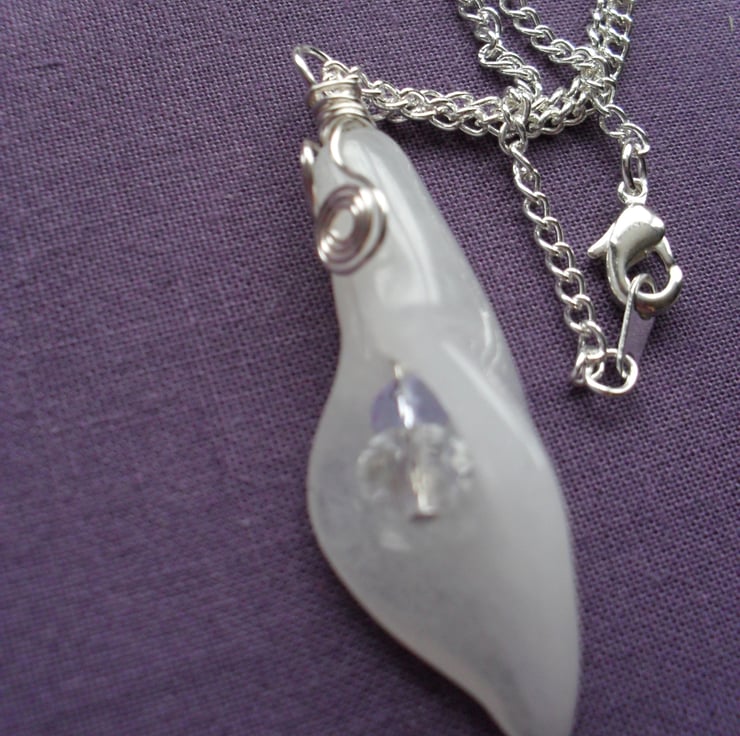 Quartzite lily flower pendant with a clear and pale lilac crystal attached to a 24 inch silver plated chain. Pendant has 2 spirals of wire to give detail at the top of flower.