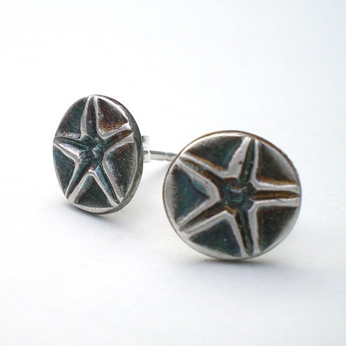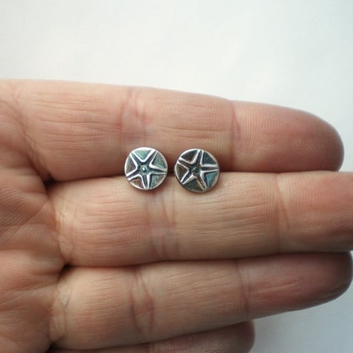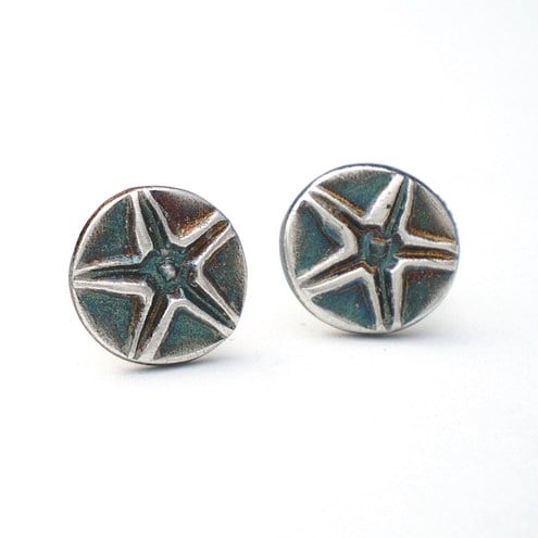 The round earrings have a small starfish design and I've given them a patina which shimmers with blue, green and purple hues. I polished the design to create the contrast between the silver starfish and the background patina.