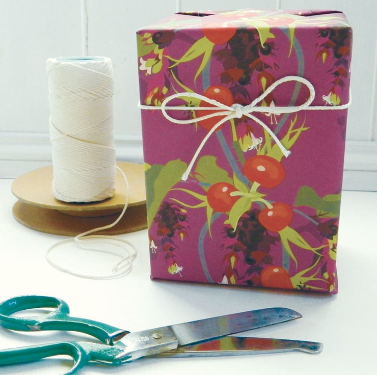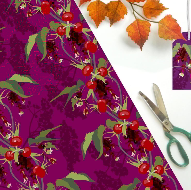 I have always adored this plant, dripping with gorgeous dark berries - so together with some 'Rosa Rigosa' hips I have made it into this beautiful Autumn gift wrapping paper design!