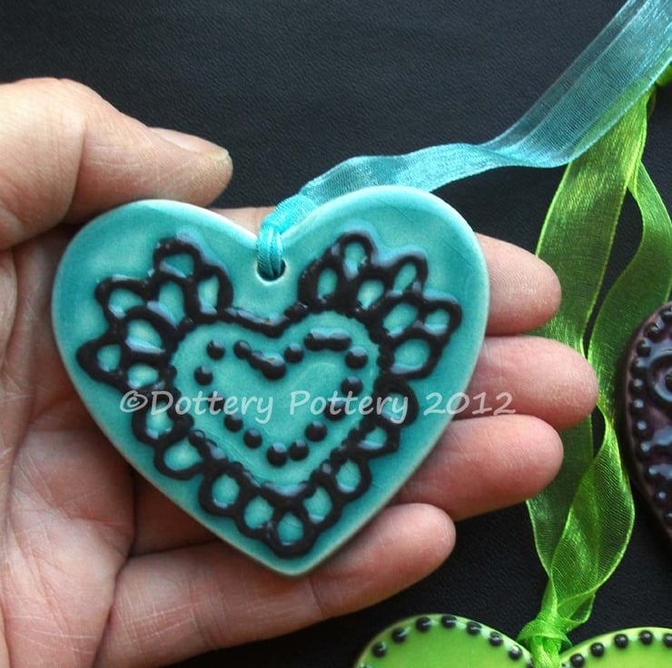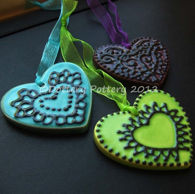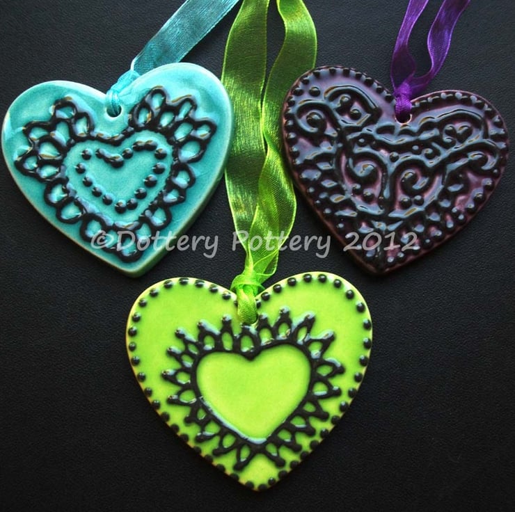 This set of three brightly coloured ceramic hearts are made from white earthenware clay.