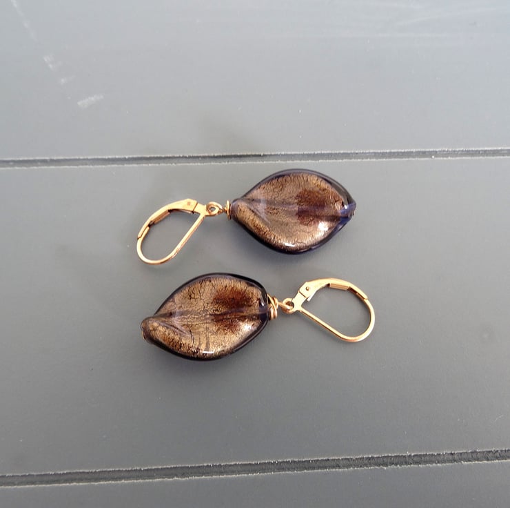 These earrings are gorgeous. They are made from genuine murano glass and are a leaf shape. They hang from 14kt gold fill lever back earwires which are stamped, they measure 4cm (1.1/2") from top of earwire. They are a lovely colour, gold foil with an amethyst hue. These are a one off piece so these are the earrings you will receive. They will arrive gift wrapped in tissue paper and an organza bag. (I only use genuine murano glass which is made on the island of murano in venice)
