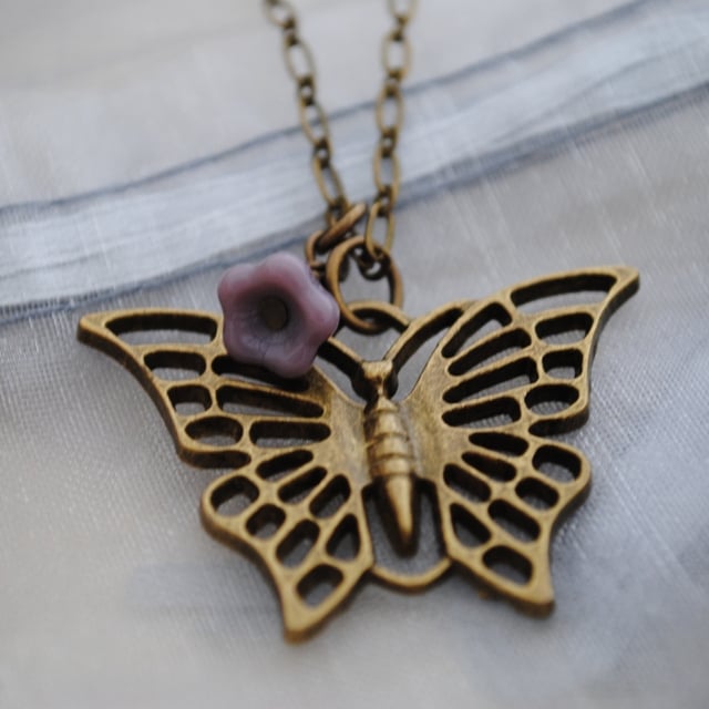 Titania butterfly necklace. This unique necklace is made with an antique brass butterfly complemented by an opaque purple flower charm. The necklace is made with antique brass chain finished with a matching lobster clasp.