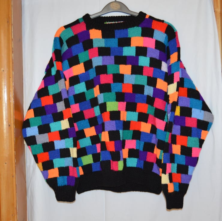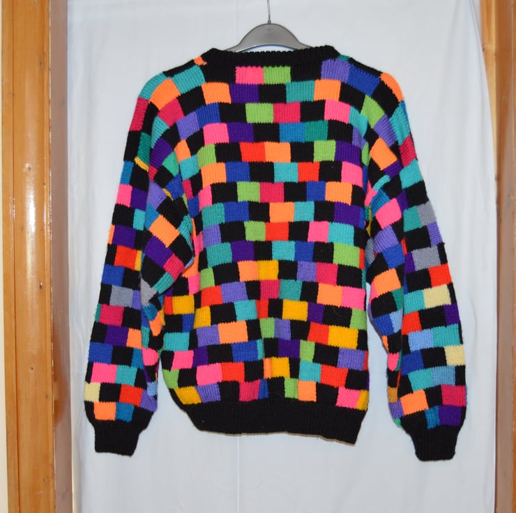 An adult multi coloured jumper. Very bright and eye catching. The size is designed ti be a nice loose fir, chest to fit 118cm and the length from the shoulder is 60cm