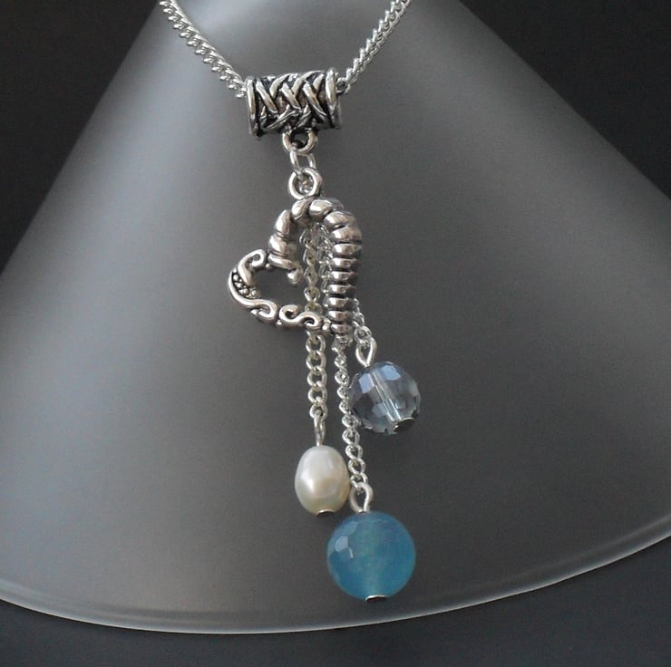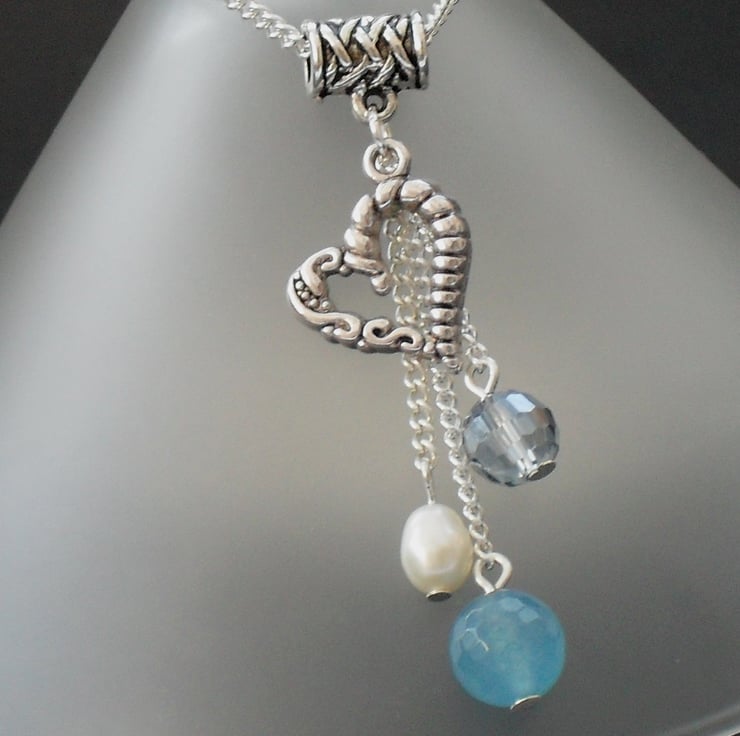A beautiful blue faceted quartz gemstone hangs with a delicate blue crystal, a single white pearl and a filigree heart charm to make this pretty necklace.