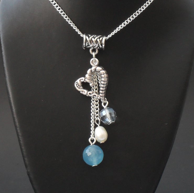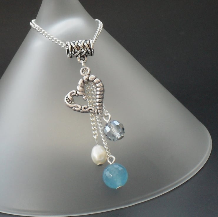 The gemstone, crystal, pearl and charm cluster hangs from a simple tibetan silver bail, and has a total drop of approximately 6 cms / 2.5 inches.