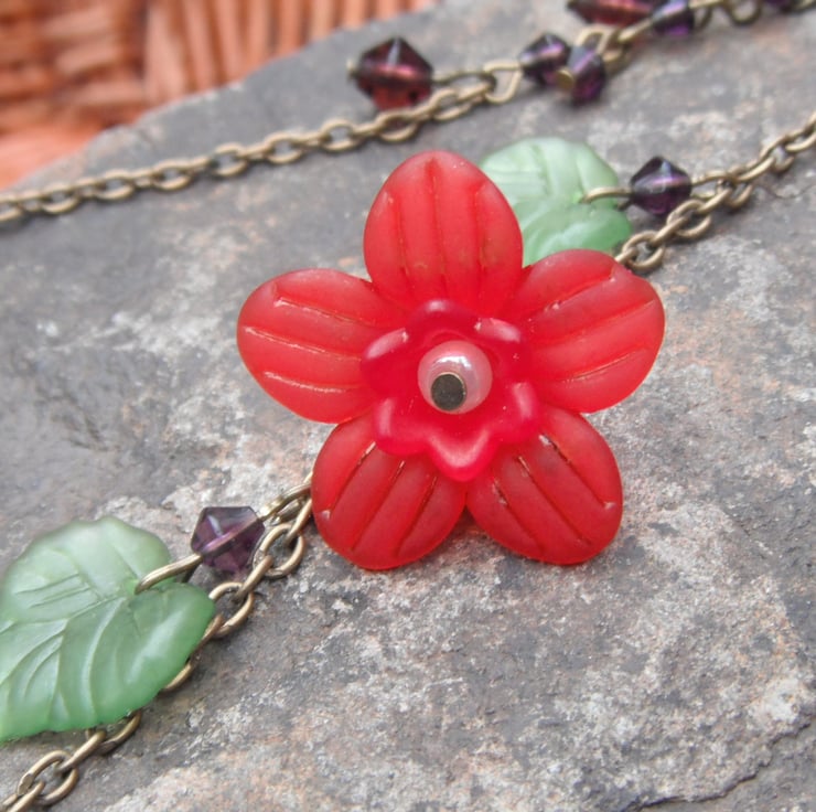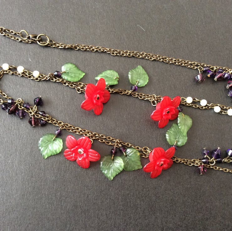 A sumptuous mix of ivory Czech glass pearls, amethyst and blackberry glass bicone beads, and beautiful lucite leaves and flowers. On a longer length vintage bronze chain, and a lobster clasp.