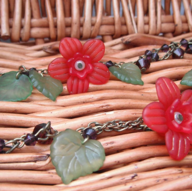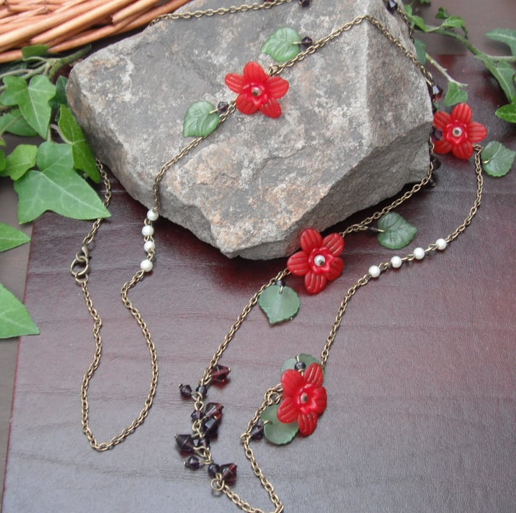 I was inspired to make this piece (which is one of my most favourites!) by the colours of autumn and winter. The pearls represent snowflakes and mistletoe, whilst the bicones are winter berries, and the lucite beads are Christmas Roses (Poinsettia).
