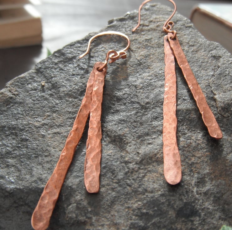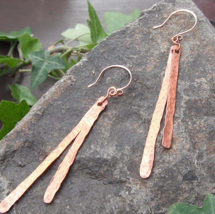 Beautiful, lightly hammered copper earrings. Made with 2 varying strand lengths of copper wire, hammered for texture, and suspended on hand forged ear wires.