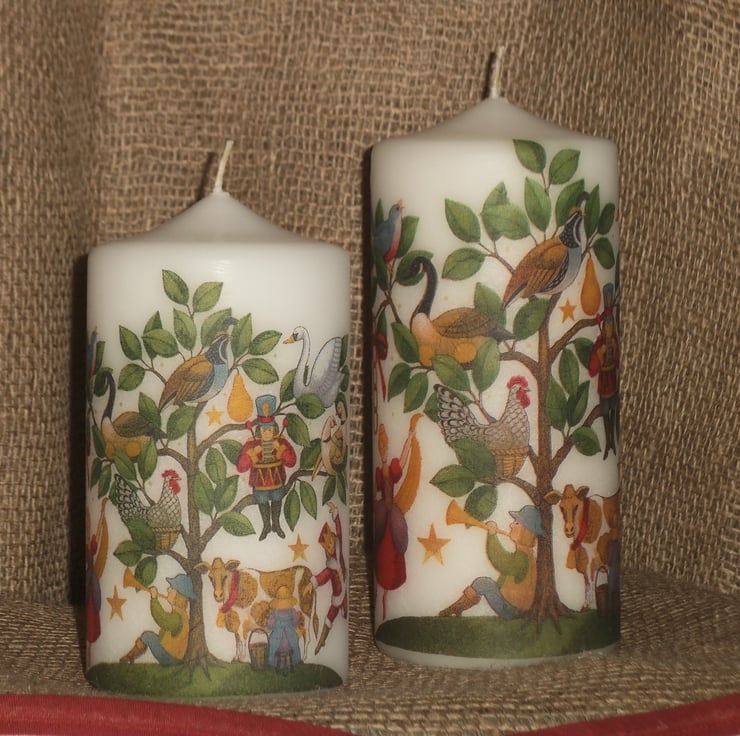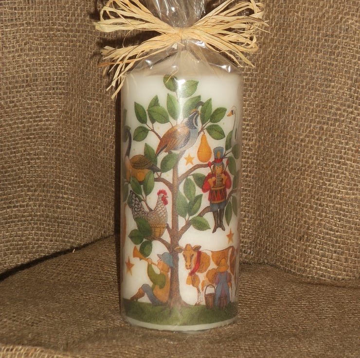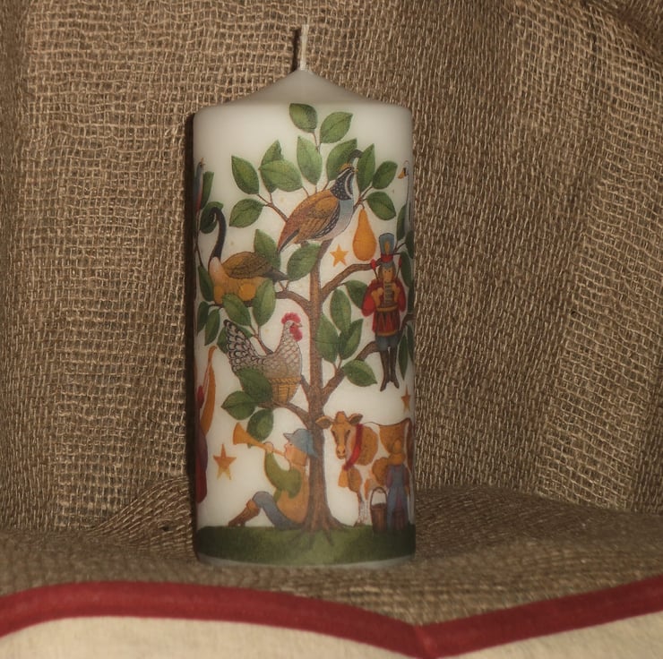 I have carefully decorated this unscented white candle with a lovely crisp image of the 12 Days of Christmas from a napkin. The napkin decoupage gives the image depth and a lovely textured feel to the touch.
