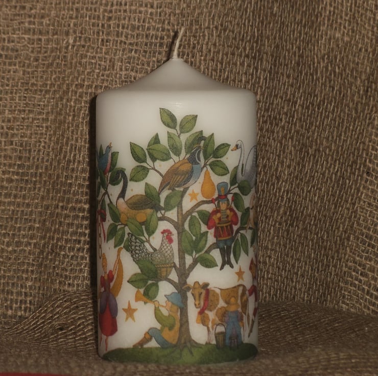 I have carefully decorated this unscented white candle with a lovely crisp image of the 12 Days of Christmas from a napkin. The napkin decoupage gives the image depth and a lovely textured feel to the touch.