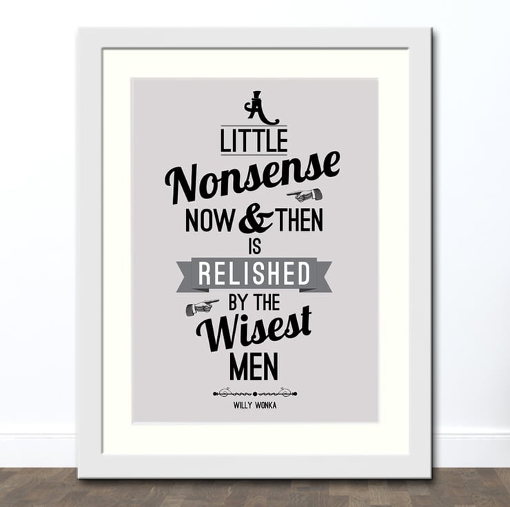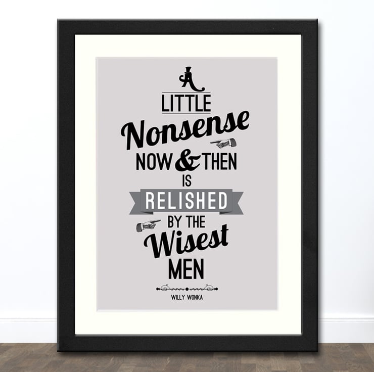 Come with me, and you'll be, in a world of pure imagination... Eccentric, visionary, poet, philosopher, maker of sweets - who doesn't love Willy Wonka?! This quote reminds us that we should enjoy being silly occasionally, no matter how grown up we think we are! Whimsical vintage style typographic design on a Soft Grey background, perfect for a grown up or child's room.