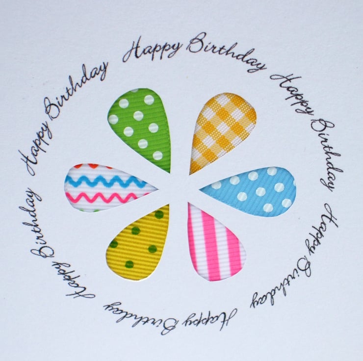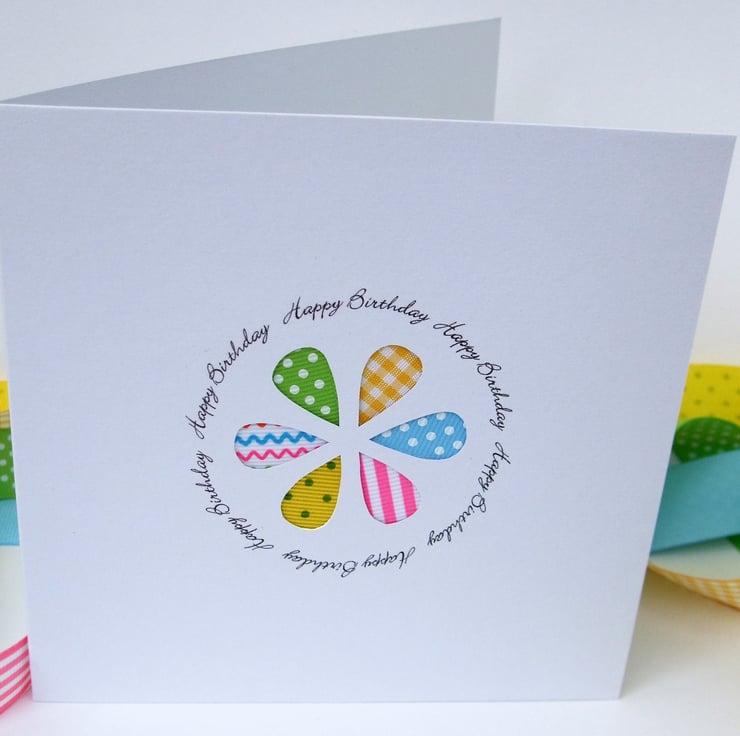 This beautifully handcrafted card made with assorted ribbons behind a handcut flower makes the perfect Birthday card!