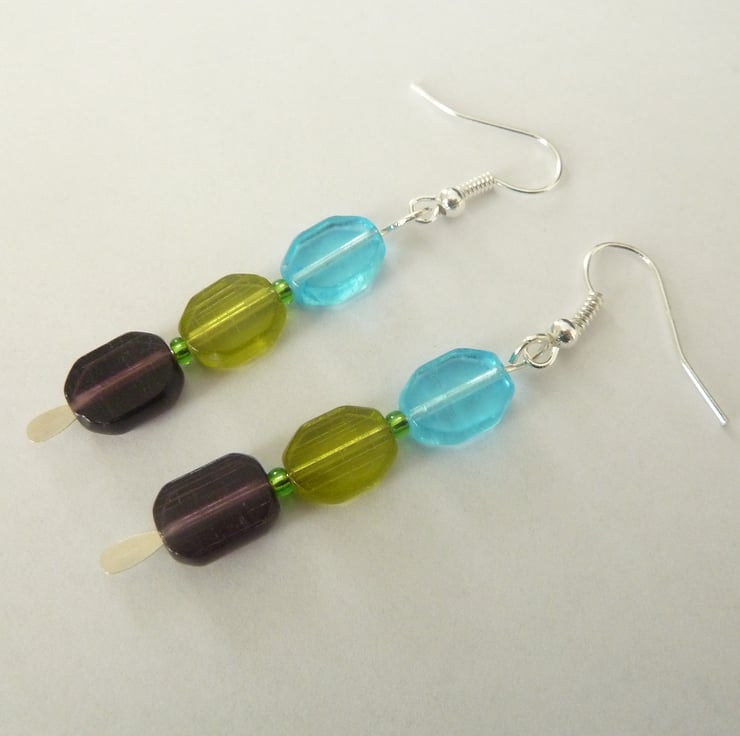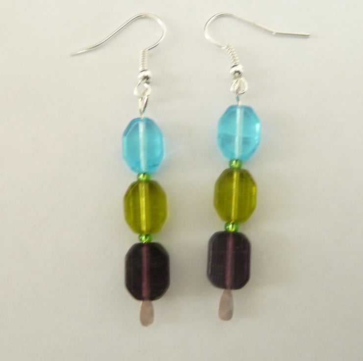 A pair of silver plated earrings which feature blue, green and purple glass beads.