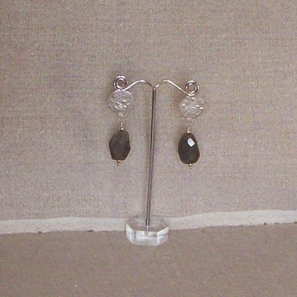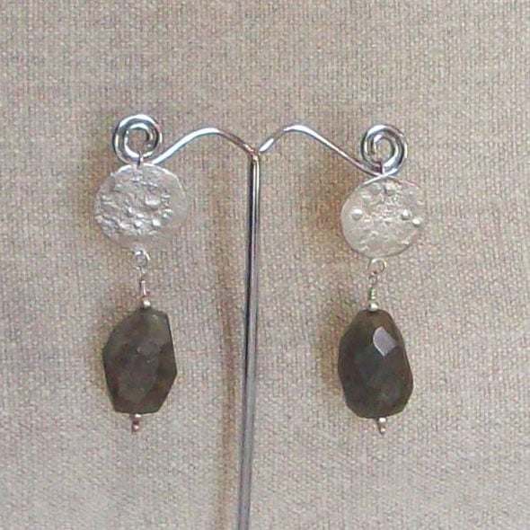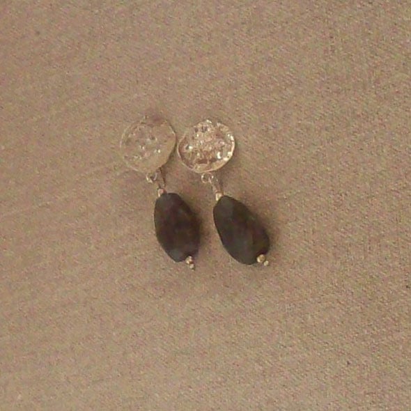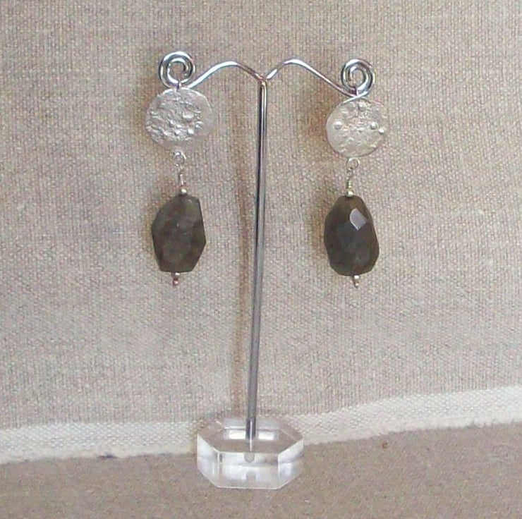 Forged and textured silver discs are teamed with faceted labradorite beads to make a simple but stunning pair of unusual earrings. A statement pair which will stylishly, unfussily embellish an outfit. The stone has blue flashes which catch the light. Comes to you in a gift box. I use Special Delivery as both buyer and seller are covered by this tracked and insured service. I do not charge anything on top for packing as I always have plenty of postal wallets I can recycle! Please contact me for multiple and non-UK postage as prices vary.
