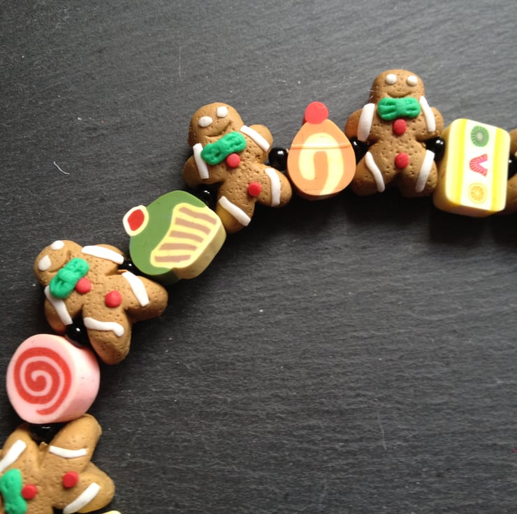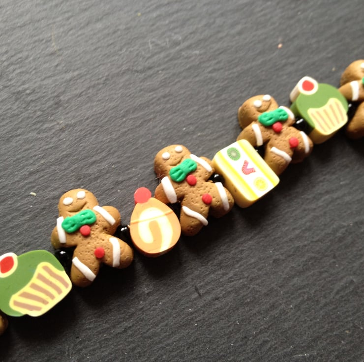 A little army of eight delightful handcrafted polymer clay gingerbread men arre combined with jam rolly pollys, gateaux, cherry topped buns and cupcakes to form this lovely seasonal beaded bracelet. Please note that since all of these bracelets are originals, your bracelet may differ ever so slightly from that pictured due to differing availability of cake beads.