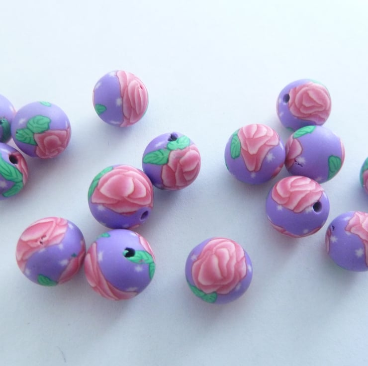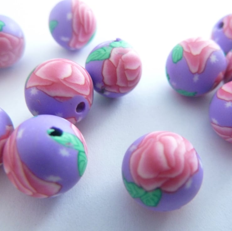 A pack of 15 polymer clay beads which are purple with pink roses.