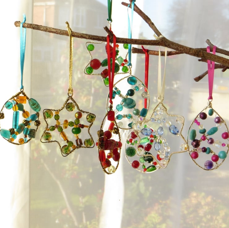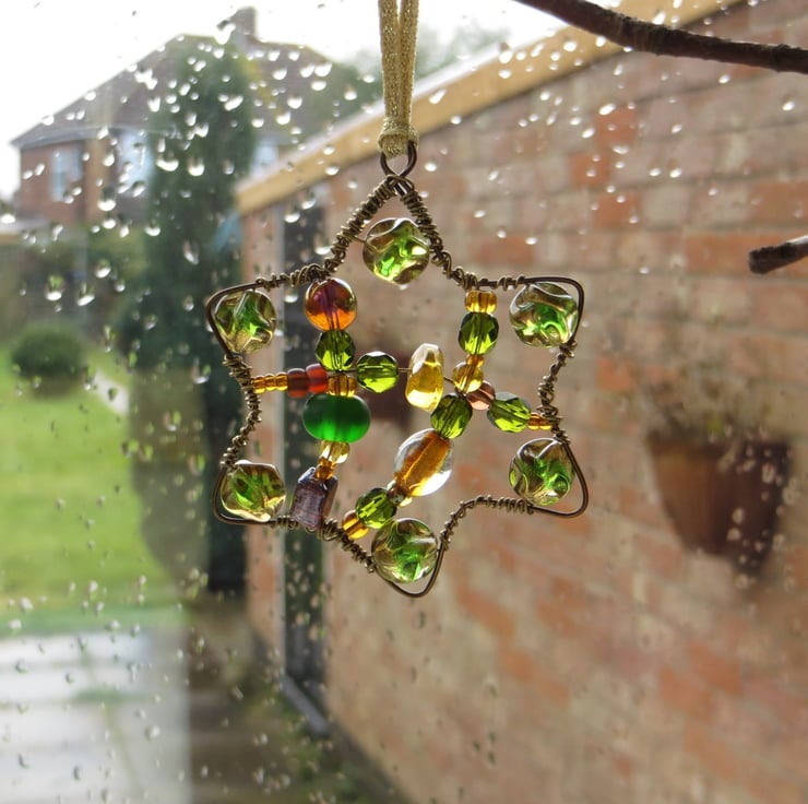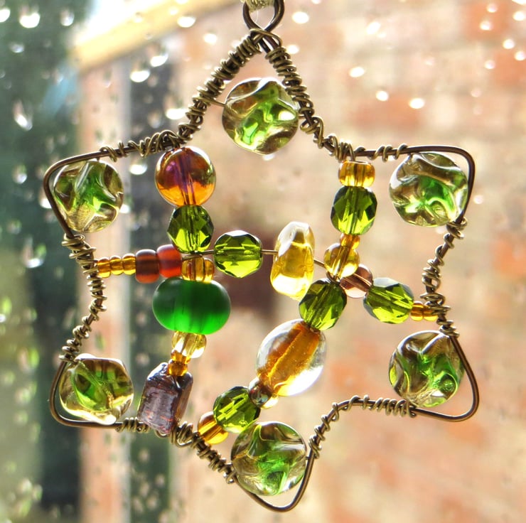 Made from a hammered antique bronze wire frame and filled with an array of olive, green, topaz and bronze glass beads, this stunning Christmas ornament is sure to add lots of sparkle and shine to your tree this year.