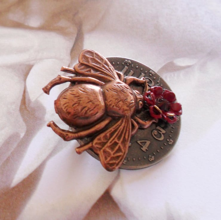 I created this Steampunk brooch from a 3D bronze bee with lovely detail on the wings and body, it has come to rest on an antique style watch dial..... perhaps to smell the small rescued Vintage red enamel flower with a crystal centre.