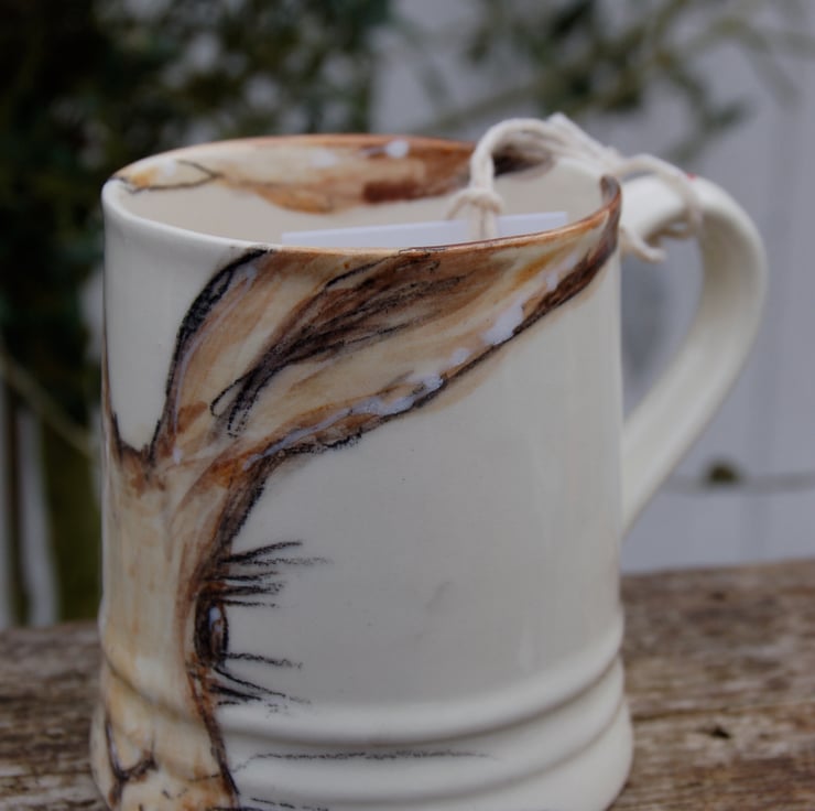 This is high fired earthenware which I then free hand paint with a hare staring straight out with his ears flopping up and over the rim of the mug. The mug is back stamped with my makers mark and is entitled 'hares and graces' and signed.