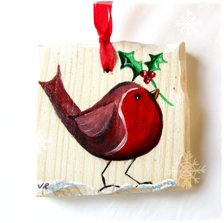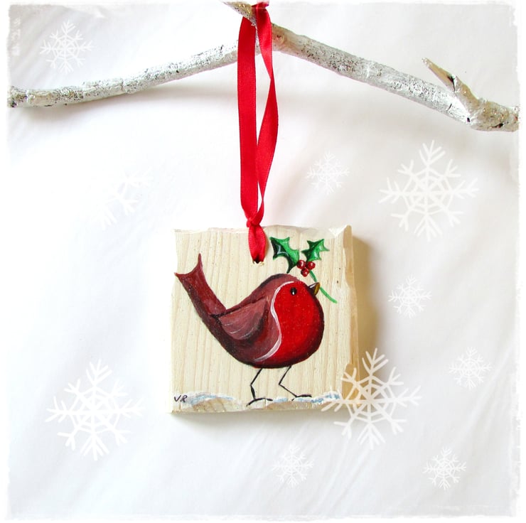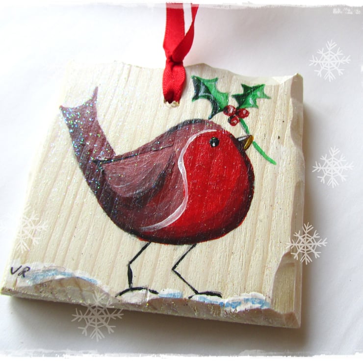 This cute little Red Robin decoration has been handpainted using acrylic paints onto wood, it has a rustic/shabby chic look and has been lightly varnished and has a sparkly finish and would look lovely hanging from the Christmas Tree or anywhere around your home.
