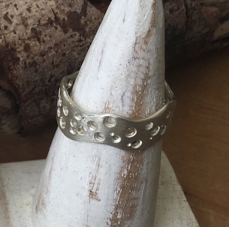 The intricate patterns formed by the foaming waves, as they pull back over the beach after rolling in, gave rise to this collection. The silver is worked into a lacework of random holes and given a satin finish.