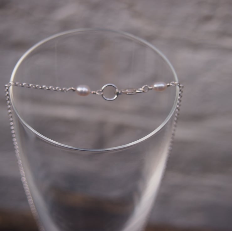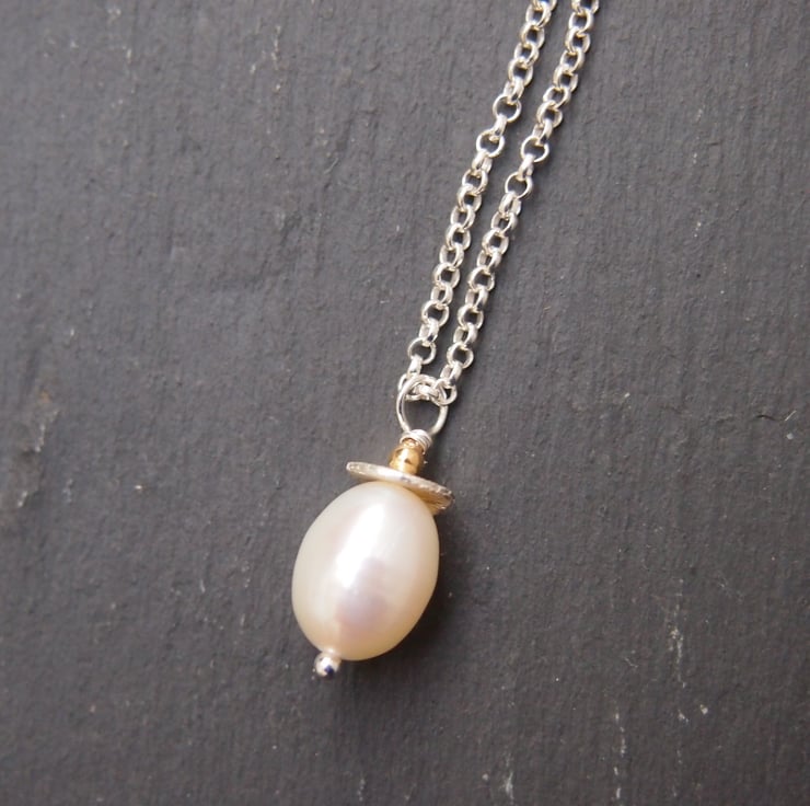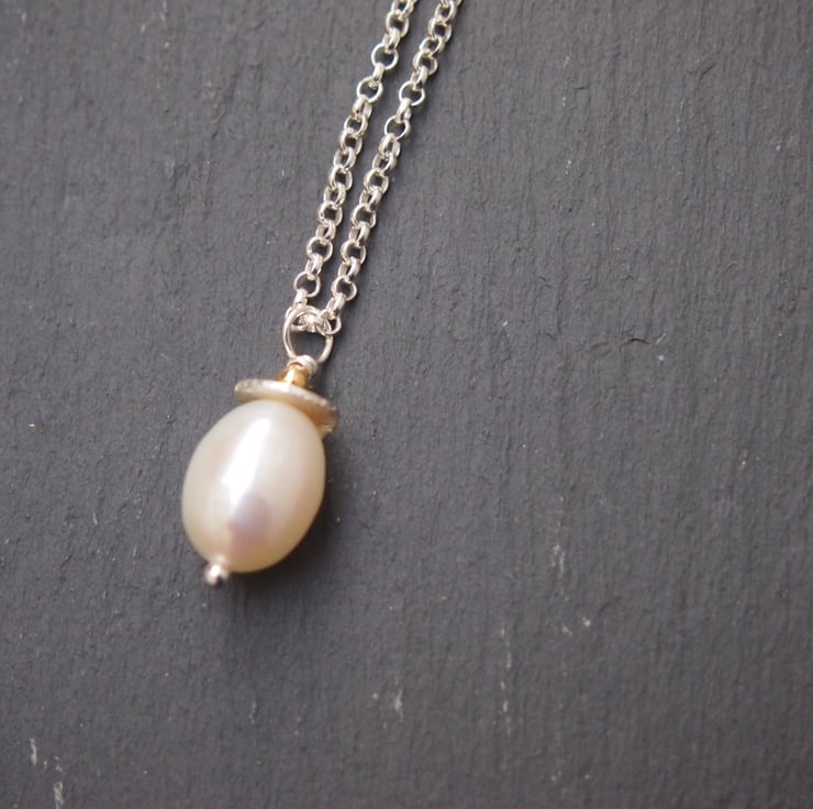 Simple and pretty pendant with a single pearl topped with a "wave-form" brushed sterling silver disc and a tiny vermeil bead, on a 46cm sterling silver chain. The sterling silver clasp is framed with two tiny pearls. The pearl pendant itself is approximately 2cm long.