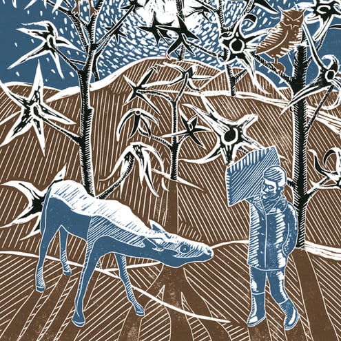 The poster is a professional digital print of an original linocut. The poster is printed on high quality off-white 170g Cyclus 100% recycled paper. From an edition of 30, hand-numbered, titled and signed.